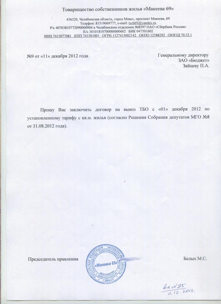 Исх №9 от 11.12.2012 ЗАО «Бюджет» О договоре на вывоз ТБО
